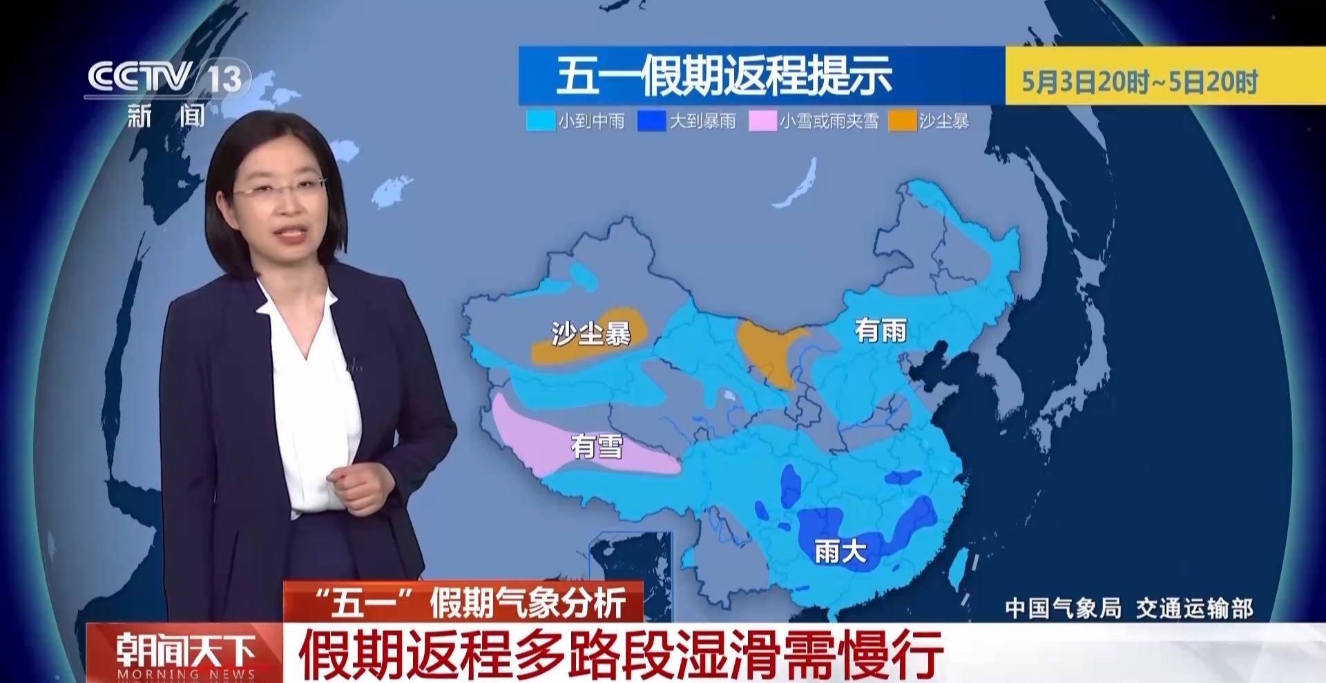 另外,在西北地区,今明两天降雨总体不多,受到冷空气大风的影响,在新疆的南部还有内蒙古西部这一带要警惕沙尘天气的出现,局地可能还会有沙尘暴。在假期返程的最后两天,除了新疆、内蒙古西部这里有沙尘暴以外,在甘肃、华北以及东北不少地方将会有小到中雨出现。